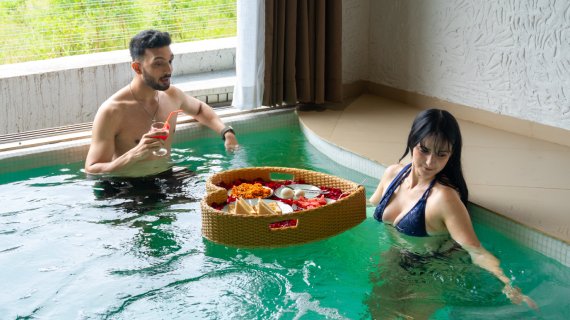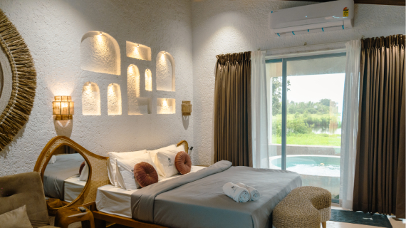 Queen/King size bed & sofa cum bed, Smart TV with OTT channels, Fitted Wardrobe, Mini Fridge, Dressing table with mirror, Hot Kettle, Bath Towels, Dental Kit, Sleepers, Free WiFi, pool/jacuzzi with open air theatre, ample of games, Live music on daily basis.